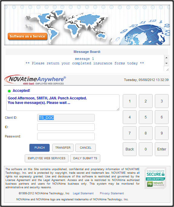 To punch IN or OUT: Enter the ID number (provided by the company) and Password, and then click the Punch button. The system will automatically determine if it is an In-Punch or Out-Punch. This same button is used to punch IN/OUT for breaks and meals.