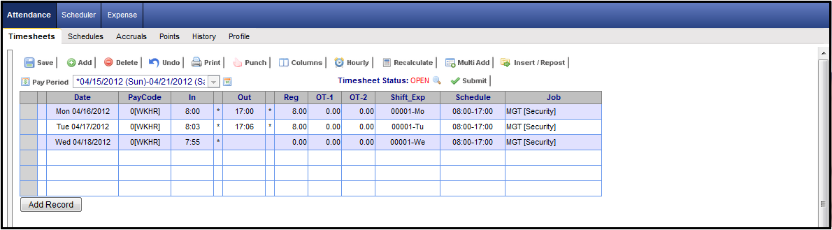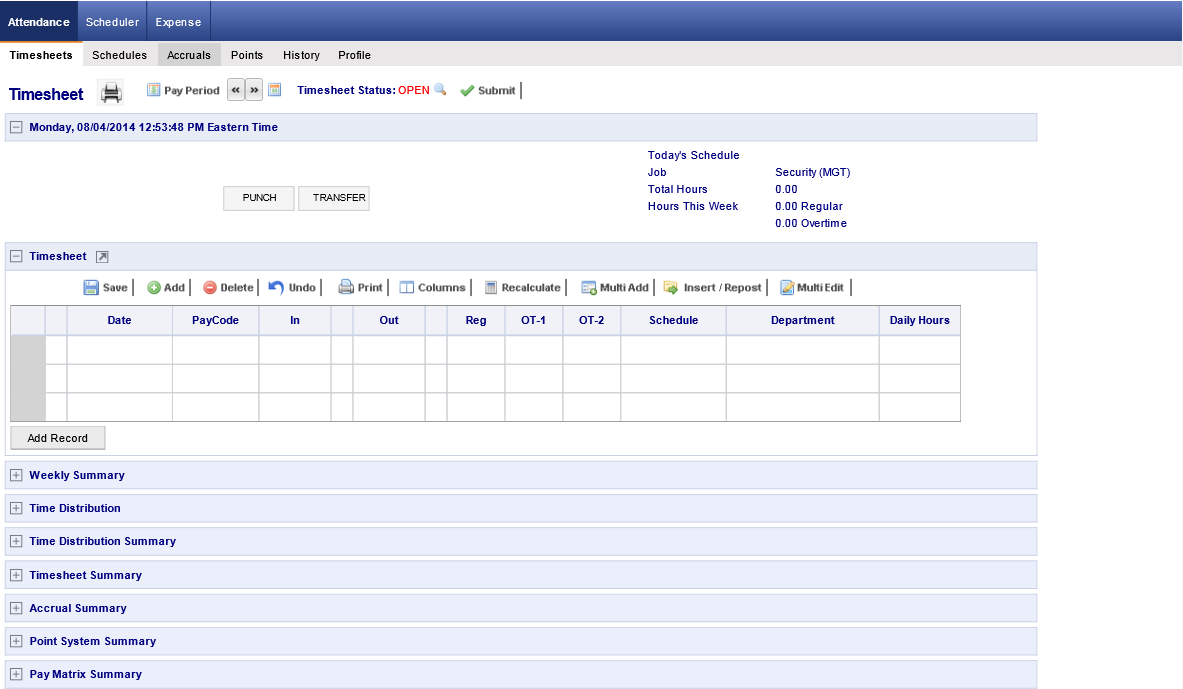 View their complete attendance history - weekly, monthly & yearly (Timecard Report). For each pay period, you can