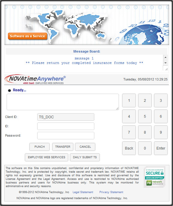 The Login page is used to punch IN/OUT, perform group transfers (Department, Job, etc...), and access the Kiosk features of the NOVAtime 4000 system.